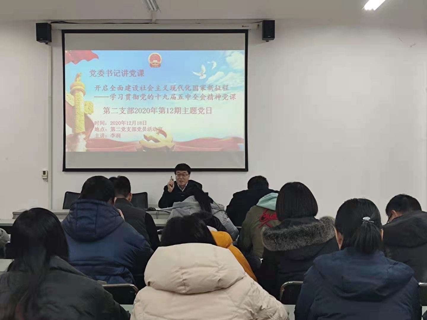 12月18日,学校党委书记李润书记以“开启全面建设社会主义现代化国家新征程”为第二党支部全体党员上了“学习贯彻党的十九届五中全会精神”专题党课。李润书记指出,党的十九届五中全会站在“两个一百年”