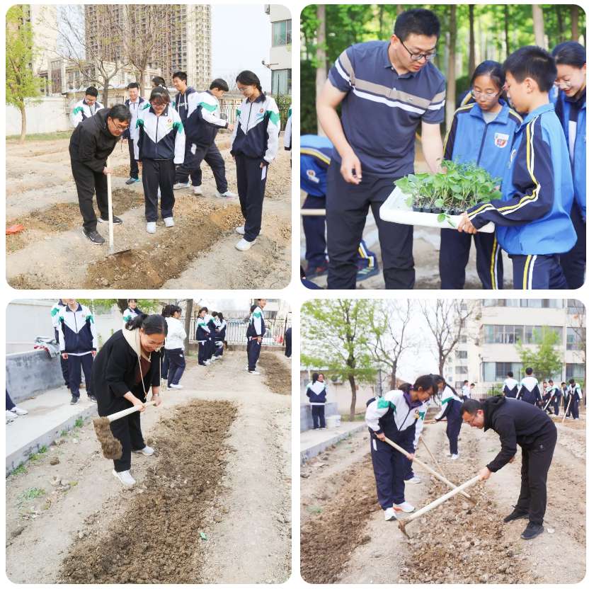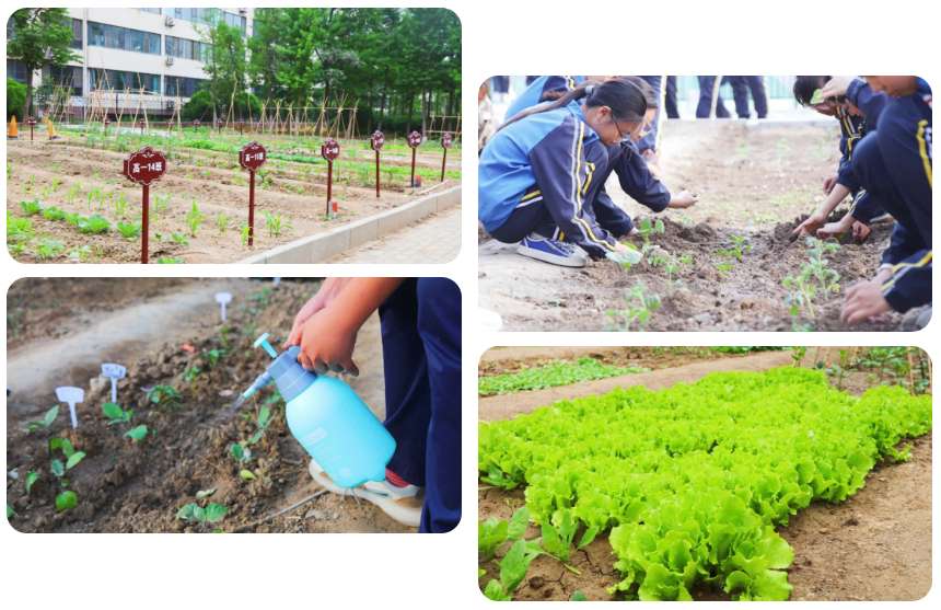 劳动实践基地内处处是一幅热火朝天的场面。开荒锄地、播种浇水,老师手把手地教,学生认认真真地学。在这里,累并快乐着!